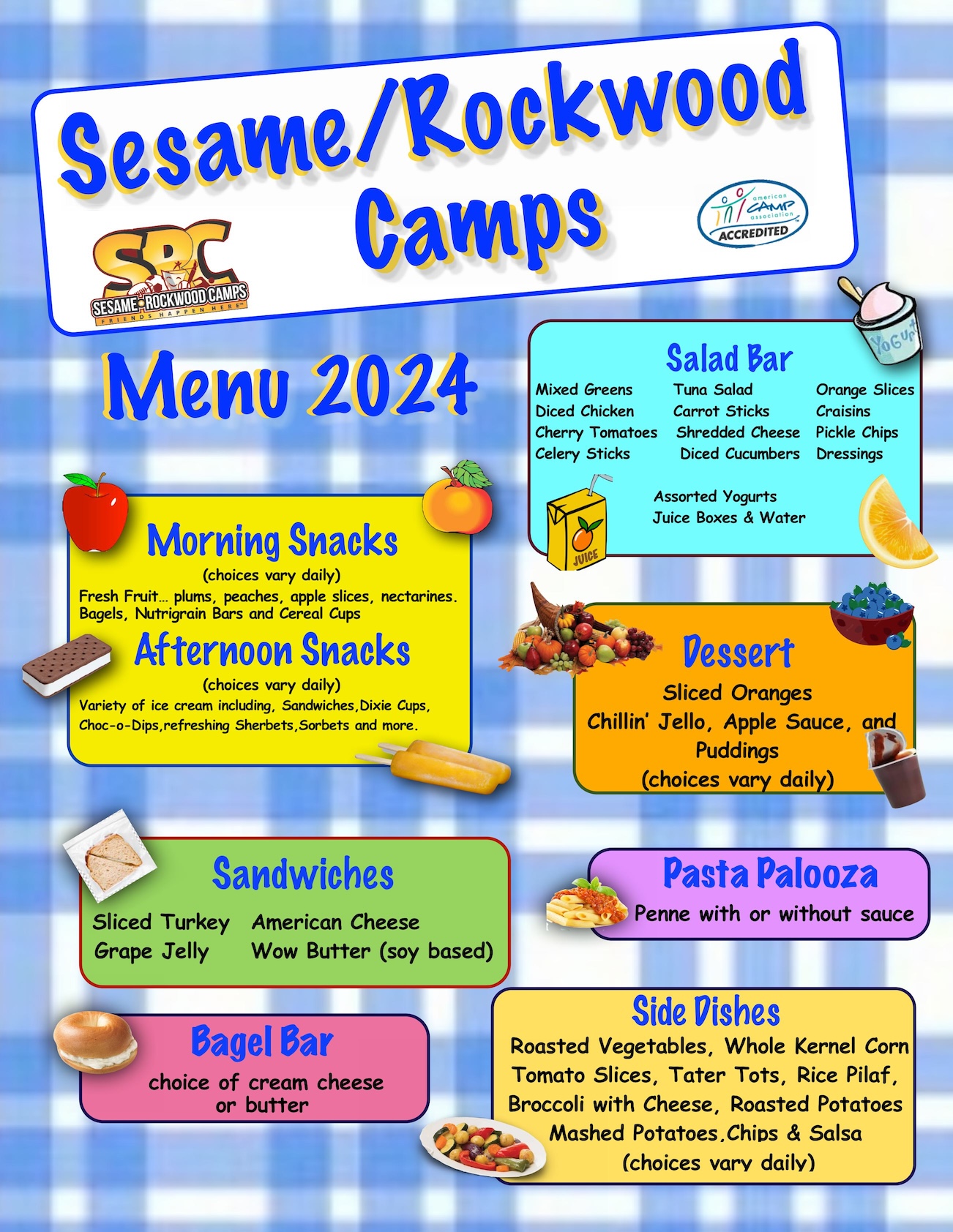 A couple of things to note: (1) we are a peanut aware camp and thus we do not have any peanut butter on our campus, (2) we provide a birthday cake for campers so we have control as to what is served at camp, (3) we do not permit any “outside” treats to be brought into camp and (4) we maintain nutritional fact sheet binders … provided by our distributor on all foods served at camp, which are available to look over at your convenience.